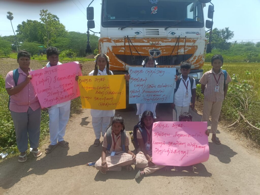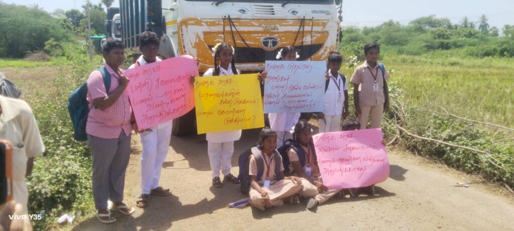 “அனுமதியை யார் கொடுத்தார்கள், எங்கள் வீட்டுப் பிள்ளைகள் விபத்து பயத்தில் உயிரை கையில் பிடித்துக் கொண்டு தினமும் போகிறதே” என்கிற பெற்றோர்களின் வேதனைக்குரல் மீது அதே “டாரஸ்” லாரிகளை ஏற்றி நசுக்கி தேய்க்காத வரை சிறப்புதான். திருவள்ளூர் மாவட்ட நிர்வாகம், தமிழ்நாடு அரசு பள்ளி கல்வித்துறை, நெடுஞ்சாலைத் துறை, லாரிகள் ‘மண்’ அள்ளிப்போக விட்டிருக்கும் கனிம வளத்துறை இதில் எடுக்கப்போகும் நடவடிக்கை, “இடைநிற்றல் கல்வி இல்லா தமிழ்நாடு” என்ற சொல்லுக்கு பெருமை சேர்ப்பதாக அமைய வேண்டும். மாணவர்கள் சாலையில் ஒதுங்குவதற்கு கூட இடமில்லாமல் ‘டாரஸ்’ லாரிகள் சாலையை அடைத்துக் கொண்டும், ஒருவழிப்பாதையை இருபுறமும் கடப்பதும்; ஈரல் குலையை பிசைந்து விடுவது போல் இருக்கும் என்பது அன்றாடக் காட்சி ஆகும். மாணவர்கள் பள்ளிக்குச் செல்ல சிரமப் படுகின்றனர், பயப்படுகின்றனர். மாணவர்களுடைய உயிருக்கு அபாயம் ஏற்படக்கூடிய நிலை ஏற்பட்டுள்ளதால், இந்த சூழலை உடனடியாக மாற்றி ஆட்சிக்கு நற்பெயரும், மக்களிடையே நம்பிக்கையையும் ஏற்படுத்தித் தர வேண்டியது காலத்தின் கட்டாயம். சொல்றதை சொல்லிட்டோம்.
